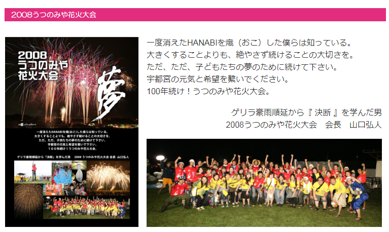 ②2008年うつのみや花火大会の会長を務めさせていただきました。一緒に本気で汗を流せる仲間が出来ました。