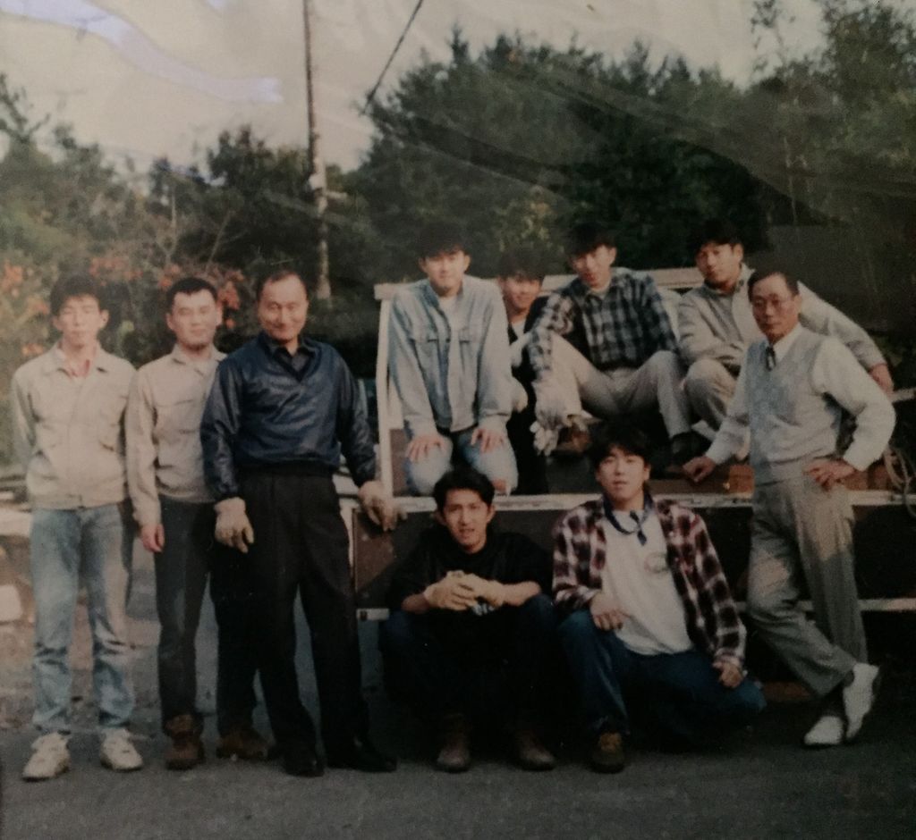 私たちの付き合いは、遡ること32年前。お互いに高校卒業後に進学した、日本建築専門学校の門をくぐった所から始まりました。その当時の写真(造園の授業にて 写真中央下段神村氏 上段山口)