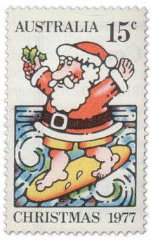 オーストラリアのサンタさんは、短パンとビーチサンダル姿で、カンガルに乗って、森の中を走っている姿です。サーフィンサンタの切手も有名です。