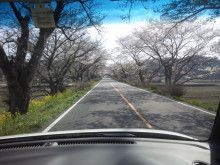 これは車内から撮影した喜連川の桜並木の写真です。桜のトンネルになった道路を走り抜けます。左側には菜の花が咲き、黄色が引き立っています。