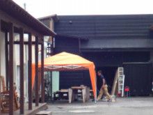 10:00の開始に向けて、テントに打ち水、扇風機と