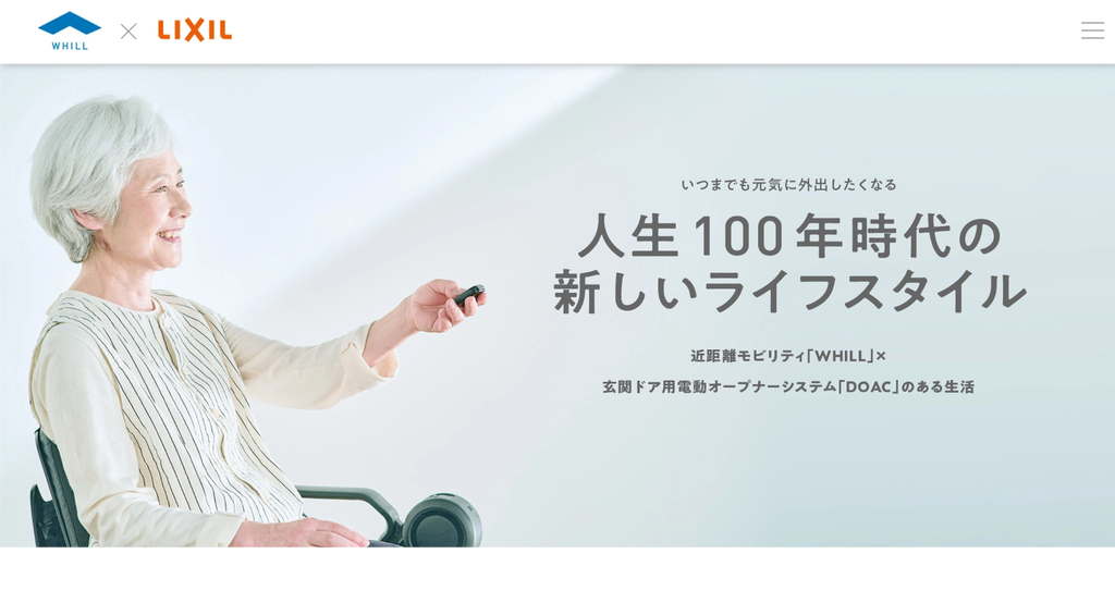 今回のブログでは、『人生100年時代の新しいライフスタイル』をテーマに、近距離モビリティWHILL(ウィル)とLIXILの電動オープナーシステムDOAC(ドアック)のある生活について紹介するwebサイトをご紹介致します。