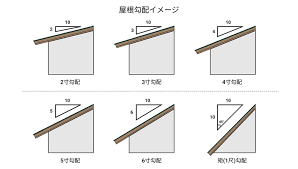 金属屋根は1寸勾配、スレート屋根は3寸、瓦屋根は4寸以上(図参照)が基準になります。