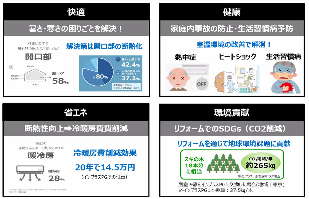 断熱性の高い窓に入れ替えることは、冷暖房費の削減はもちろん、熱中症やヒートショックなどの健康状況にも大きく影響してくる、私たちの生活にとって、非常に重要なことなのです。
