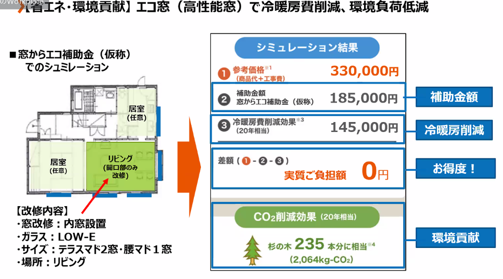 仮に33万円かけて、リビングの窓を高性能にした場合、補助金と節電で、20年後には実質負担が0円となる予想も出ております。