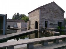 ジモト芦野石の古い石蔵と新しい建物の6棟が、水に浮かぶ石の通路でつながれた小さな美術館。