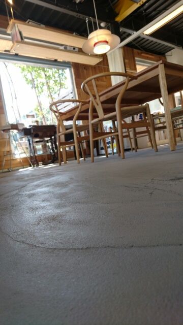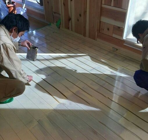 フローリングの目地を埋めて、床にモルタルを塗っていきます。