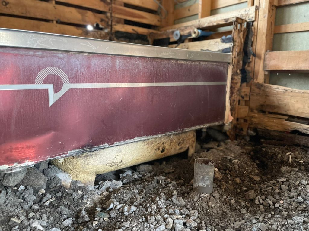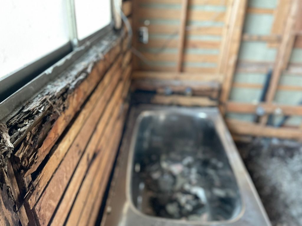 *写真は、浴室部分の延焼部分と、柱等の腐れと蟻被害のようす。築年数が30年以上経過した家の在来浴室(ユニットバスではない)では、このような被害はよく確認されます。