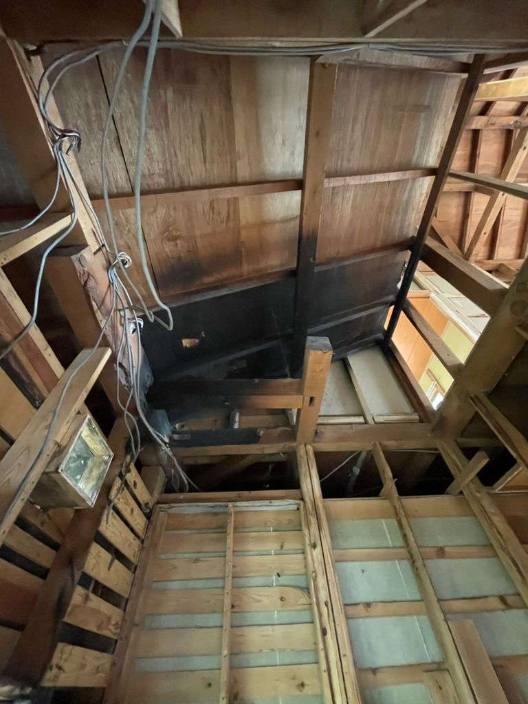 こちらの現場でも、「いやぁこどもが小さい時に、お風呂場で空焚きして、ボヤ騒ぎを起こしたんだよねぇ」と。黒焦げの梁を見上げながら、当時の想い出をお父様がお話下さいました。