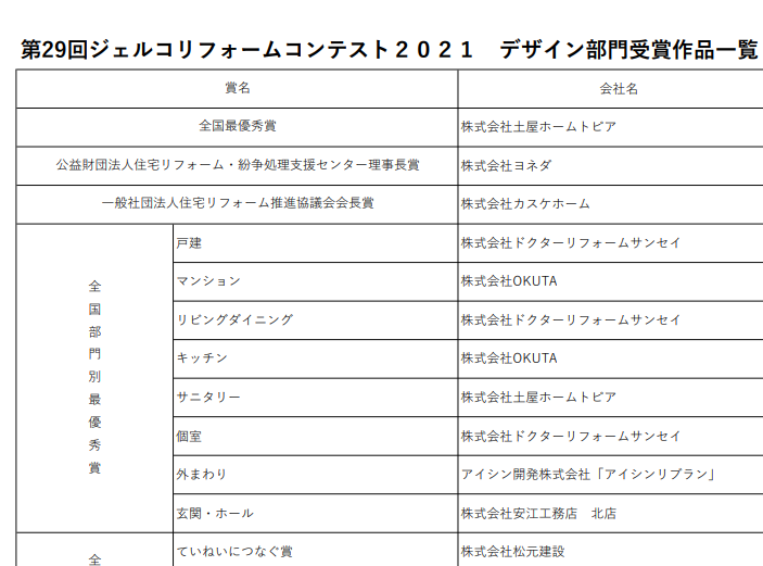 今年で29回目を数える、日本住宅リフォーム産業協会主催『ジェルコリフォームコンテスト2021デザイン部門』にて、全国最優秀賞を3部門で受賞することができました。