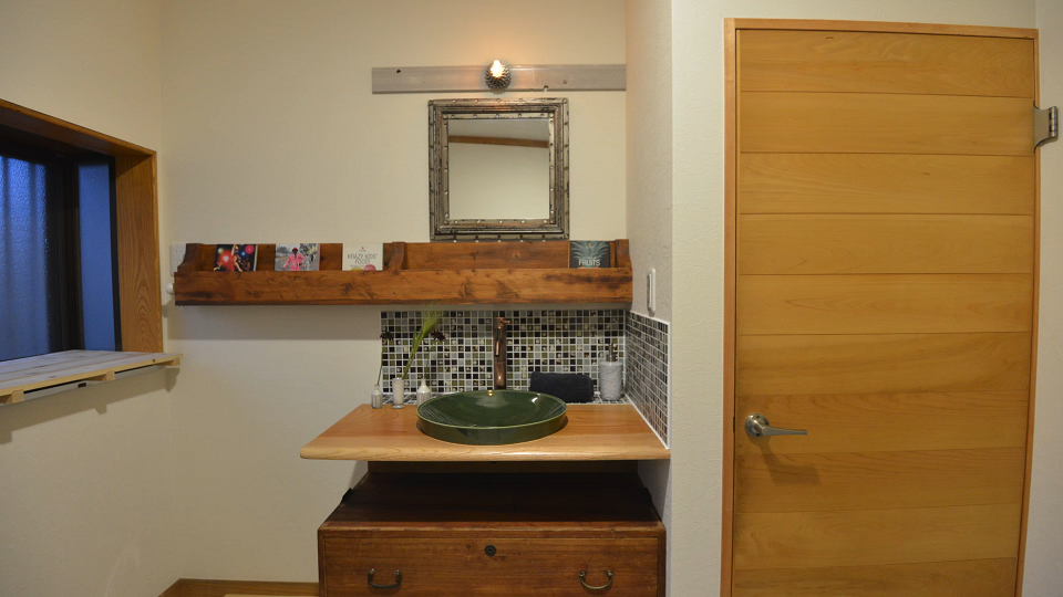床張りや洗面台のケヤキ板のオーバーホールは、斎藤さんの自慢のDIY。廊下を収納クローゼットにしたり、床の間や仏間を書斎や飾り棚にしたり、愛着ある桐タンスを洗面台下の収納に活用したりするアイデアはドクターリフォームの提案。奥様は、キッチンと壁の葉っぱのタイル、温もりある和風テイストの個性的な照明が気に入ったそうだ。運搬用パレットを使ったウッドデッキも、ドクターリフォームならではの提案。