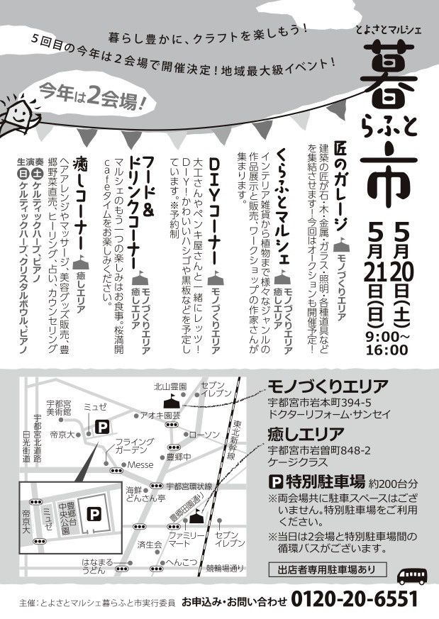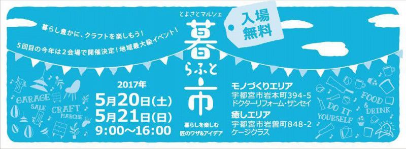 2013年にスタートした、とよさとマルシェ暮らふと市が今年も5月20(土)21(日)に開催されます。モノづくりの作家さんを中心に合計200店の出店者さんを大募集!お申し込み順で定員になり次第締め切りとなりますので、出店をご希望される方はお早めにお申し込みくださいね。