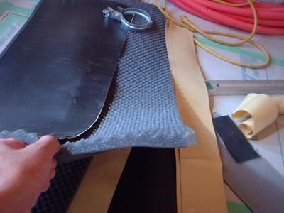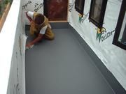 透湿防水シート施工状況:外部からの防水性と内部からの透湿性があり、住まいの保温性を高めてます。開口部廻りの防水テープは施工手順に注意し・バルコニーのシート防水では勾配や立上りの処理にしました。