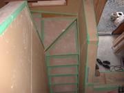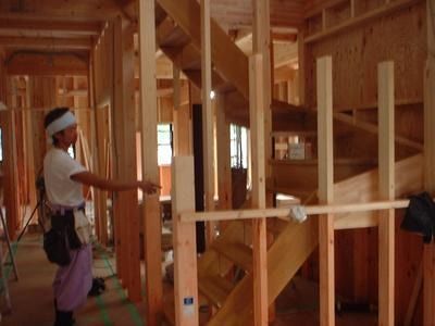 内部造作の様子です。階段を組上げ一段落の大工さん!すぐに養生板を敷設し後工事のキズ防止に努めます。