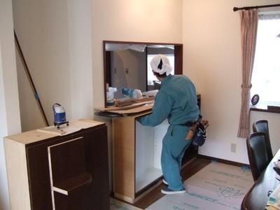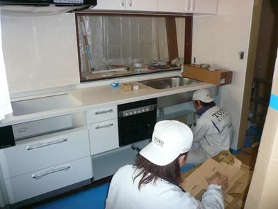 写真1 → システムキッチンを据え付けているところです。今はかなり一般化してきている食器洗浄機付です。奥様もさぞかし楽しみにされているのではないかと思います。