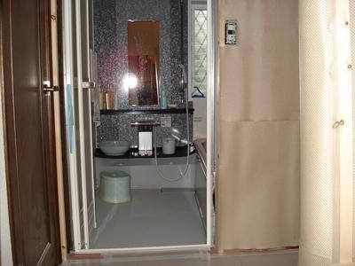(写真左に仮設の脱衣室とシステムバスの写真を掲載予定です。)