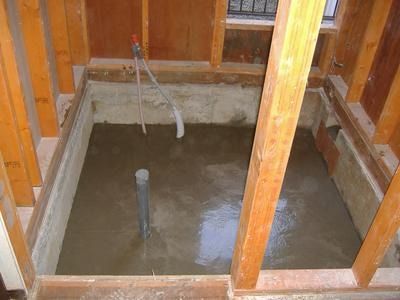 写真左 → 浴室の埋設配管が完了し、システムバス据付のためのコンクリート打設完了