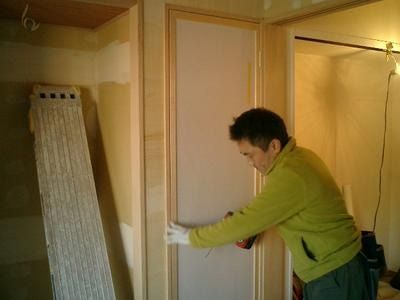 素材や色、デザインを好きなようにイメージし、それを大工さんに作ってもらった枠に取り付けます。大きめに作って現場でサイズをあわせて削ったり、加工したり。扉の一つ一つを微調整し、スムーズな動きで開け閉めが出来るようにします。