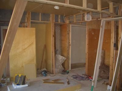 墨出し作業をして間仕切り間部の位置を決めていきます。そしてその墨の位置に沿って柱を立てて壁を作っていきます。