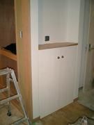 素材や色、デザインを好きなようにイメージし、それを大工さんに作ってもらった枠に取り付けます。大きめに作って現場でサイズをあわせて削ったり、加工したり。扉の一つ一つを微調整し、スムーズな動きで開け閉めが出来るようにします。