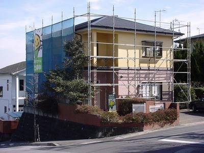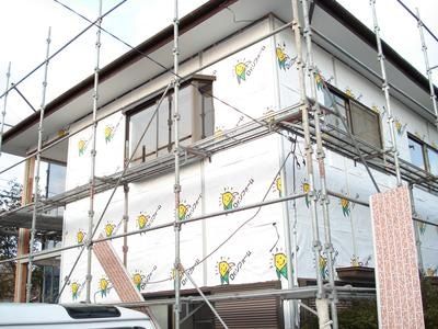 既存の外壁はモルタルに吹き付け塗装されていましたが、今回のリフォームでは、その上から金属サイディングを張ります。まず、木製の胴縁を打付けその上に透湿防水シート(写真は弊社オリジナルのバナナマーク入り透湿防水シート)を張り、サイディングを張っていきます。もちろん既存壁を壊して新たに下地を作りサイディングを張る方法もありますが、今回の方法ではコストを抑えられるのと同時に工期の短縮にもつながります。さらに産業廃棄物の削減にもなります。既存を残しつつも新築のように生まれ変わる完成が楽しみです。