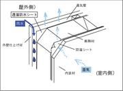 ※通気工法と透湿防水シート:室内で発生した水蒸気など湿気を含んだ空気が万一壁体内に入り込んだ場合、湿気は透湿性のある透湿防水シートから通気層を通じて屋外に排出され壁体内結露の発生を防止します。また、外壁仕上げ材の接合部等から浸入した雨水が壁体内に入り込むことを防ぎ、速やかに排出します。