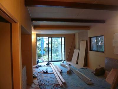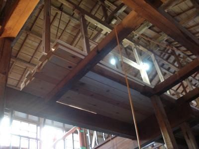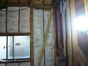 大工工事も最終段階になってきました。外周面の壁には断熱材が入れられ、柱間には筋交いという補強材がバランス良く入れられています。天井・壁には石膏ボードが張られ段々と形になってきました。