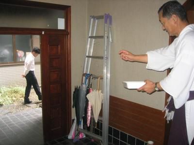 神主さんが今まで「ありがとう」という気持ちとこれから工事するにあたっての災いなどが起きないようにと清めているところです。暗く仕切られた空間がどのように変わっていくのでしょうか?どうぞお楽しみに!