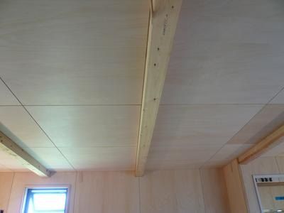 木工事が順調に進んでおります。以前補強桁が見えていた部分は天井や壁に化粧のシナベニヤが目透かしで貼られました。