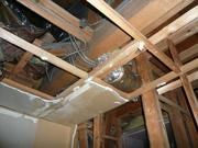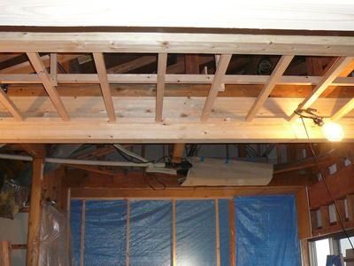写真1…柱を抜く部分等の梁補強が完了し、天井の下地を造作しています。(この部屋はダイニングで天井に間接照明が取付になる予定です。梁は化粧で半分見えてきます。)