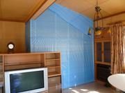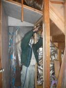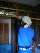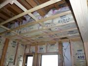 写真2…外気に面する部分は天井・壁・床共断熱材を入れて行きます。(写真は途中ですが、天井と壁に断熱材が入れられている様子です。)確実に隙間なく入れられているかチェックします。