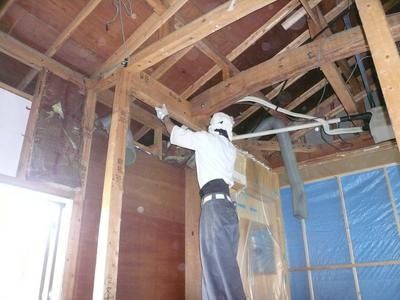 写真3…既存の梁等が見えてきている状況(補強が不足していると思われる箇所は既存部分も金物等でしっかり固定していきます。)