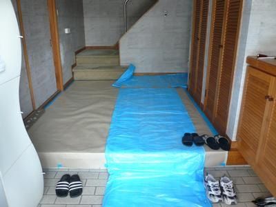 写真1…ダイニングの天井・壁の塗装が完了し照明器具が取り付けられています。間接照明が点灯していい雰囲気になっています。今から廻りの養生を外すのが楽しみです。