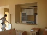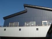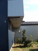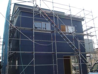 外壁には濃いブルーのガルバニウムが貼られています。落ち着いた感じでとても引き締まって見えます。ユニットバスも収められキッチンを取り付け中。いよいよ完成までカウントダウンが始まりました。