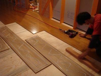 床の下地に取り付けられた銀色のパネル。コレが現代の床暖房なのです。電気式ですので安全で輻射熱で空気もキレイ。お子さんがいるお宅には最適ですね。今回オール電化も取り入れますのでコスト的にもお得。仮住まいにお住まいのご家族も完成が待ち切れないことでしょう。