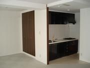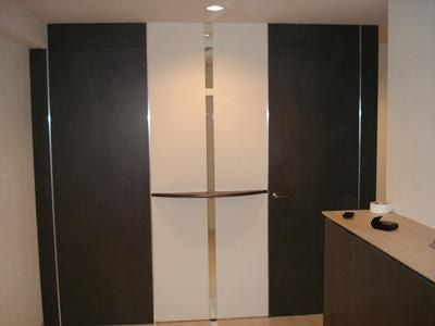 壁のクロス、床のタイルカーペットも仕上がりもうすぐ完成です。玄関入って正面の壁は左右対称にできていますが、片側はなんと入り口のドアになっています。又マンションでは下階への音漏れを防ぐためタイルカーペットは防音ラバー付になっています。