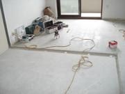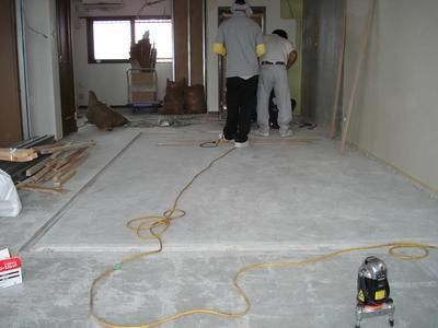 既存のフローリングも綺麗に剥がされ、大工さんが床の下地の工事をしています。既存和室部分の床コンクリートが下がっていたため周りとのレベル調整をしています。着工前の現場調査時に高さ関係はしっかり調査するので予定通りの工事です。調査を怠るといざ着工して畳を上げた時に「あれっ、高さ違うじゃん!」なんて事もありえますからね。このような事が起きないように現場調査は入念に行います。
