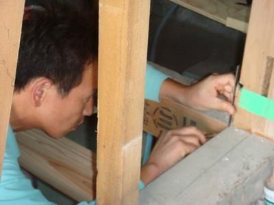 年数を重ねた建物は、人の身体と同じくクセを持っていますので真っ直ぐ建っていることなどほとんどありません。差し金を当て傾きを測り古い骨組みと新しい仕上げを上手く融合させていきます。