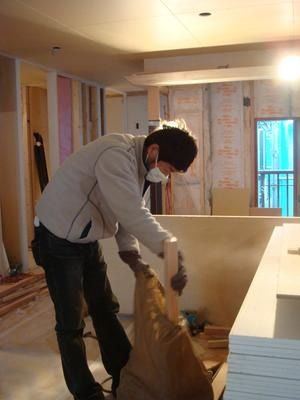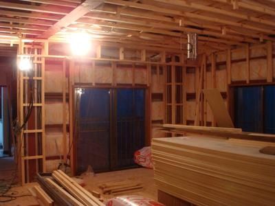 壁や天井に断熱材を充填し、壁の下地を施工中。