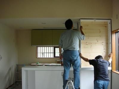 天井の木板貼りや、間仕切りのパーテーションも取り付けが完了し、最終段階の収納家具が運び込まれました。