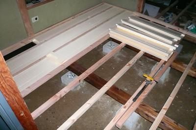 築20年を越える住宅は大抵の場合、床下の断熱材が入ってません。このような場合、下地を組み替えると同時に、その間に断熱材を敷きこみます。もし、湿気がひどいようであれば、その下の土の部分に調湿剤や湿気止めのシートを敷く場合もあります。