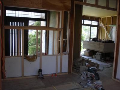 現場では、解体工事が終了し、リフォーム部分の床・壁・天井が剥がされ、大工工事に進みます。