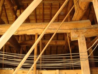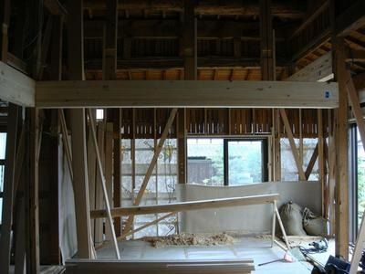 柱を抜いた部分に補強用の大きな梁が入り大工工事も順調に進んでおります。これだけの重さの梁を高く持ち上げ柱に結合して行くわけですから、当然ひとりの力では不可能です。