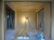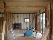 工事は、天井に無垢材を貼り、床の下地も完成。壁の断熱材や外壁の漆喰工事に進みます。