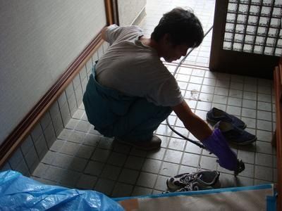 今回の工事でもLDKの素敵な空間とは別に、玄関周りの土間下などにシロアリを防ぐ処理を施しました。タイルに小さな穴を開け薬剤を注入!アリコロリ。
