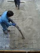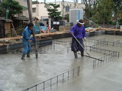 山林だったため、地盤が多少弱く地盤改良をし、基礎の鉄筋を組み、自社だけでなく第三者機関の配筋検査をクリアし、コンクリートを打設しました。ご近所さんのご好意で隣の林が借りられたお陰で、スムーズにミキサー車・ポンプ車も設置する事が出来ました。