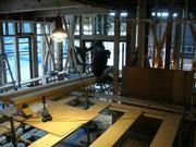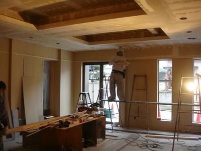 外壁部分には濃いグリーンと茶色が塗られ、シックなお店のイメージをグッと完成に近付けています。そして内部の仕上工事もOPENに向け着々と進行し、リフォーム工事のゴールが見えてきました。