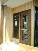 外部の仕上げは、無垢材(パイン材)を使っていきます。写真では白っぽい色ですが、この後に塗装をし仕上げます。