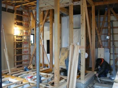 柱の位置を移動し補強を施し、新しい間取りに近づいて行きます。