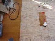 そして、今回の重要なポイントでもある全面バリアフリー化を実現させるために、今まで貼ってあった既存のフローリングを下地として利用する部分と、段差を取り除き新たに下地を造った部分が1ミリの狂いもなく貼り合わされています。キッチンが据え付けられる予定位置には、給水・給湯・排水菅が1階から立ち上げられています。